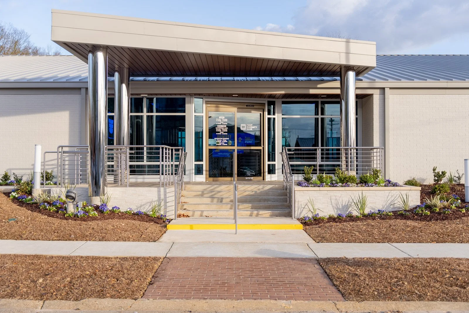 This project involves the complete renovation of a 6,850 SF bank constructed in 1974. The renovation transformed three buildings, initially connected by a storefront skylight, into a single structure unified by a new structural steel framework. The exterior renovation included painting the existing exterior brick, adding a new structural steel extension for the drive-thru lanes and bank teller area, and installing a standalone steel structure at the bank’s entrance to replicate its signature look.