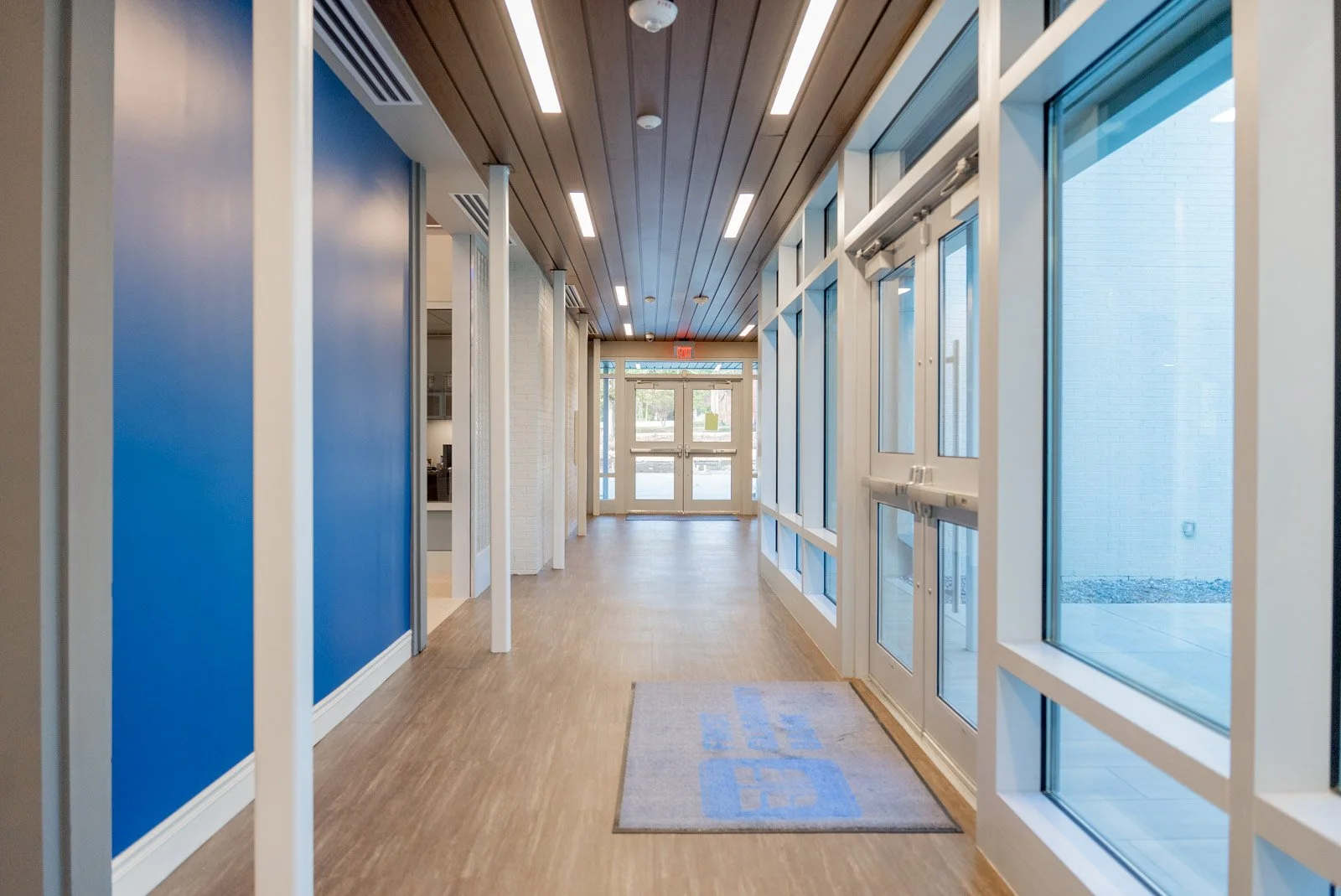 The interior underwent significant renovations, retaining some of the original architectural charm. It features high ceilings with exposed wood trusses in the lobby, metal linear ceilings, Marlite wood wall panel systems, sheetrock walls, curtain wall office partitions, and a combination of carpet tile and LVT throughout. This project successfully modernized the building while preserving its original appearance, a crucial consideration for the owner, as this was the bank's inaugural branch.