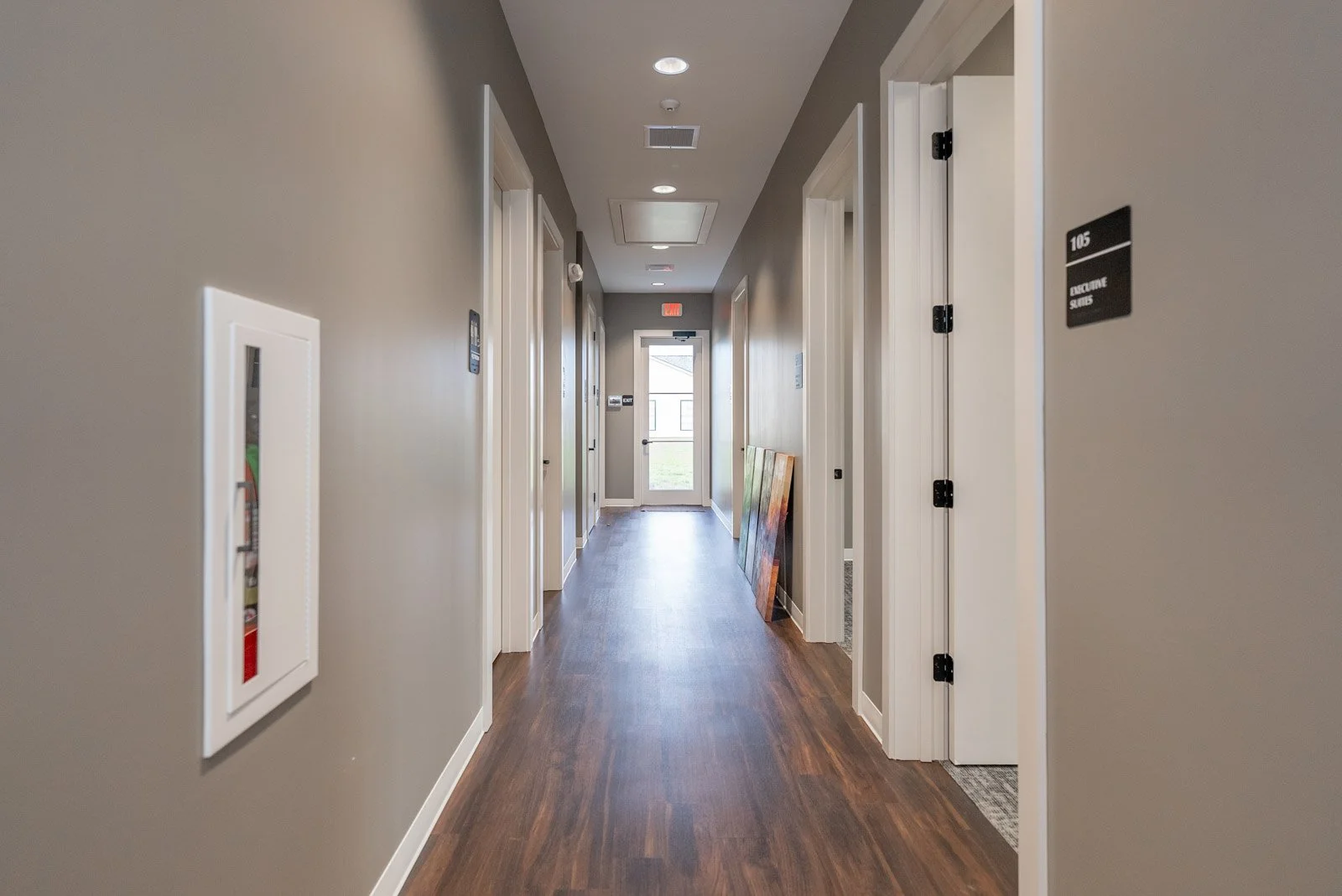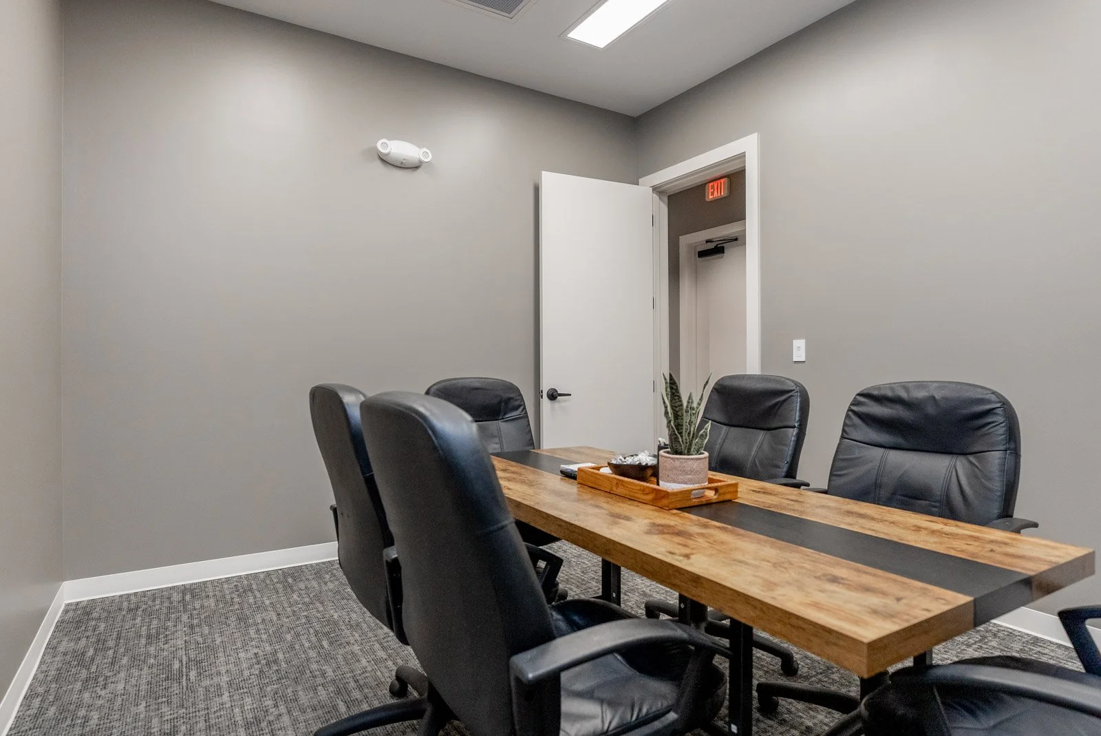 Newly constructed, this 3,000 square foot stick-framed office building features nine private offices available for lease, along with shared conference rooms and a well-appointed breakroom equipped with modern kitchen appliances.
