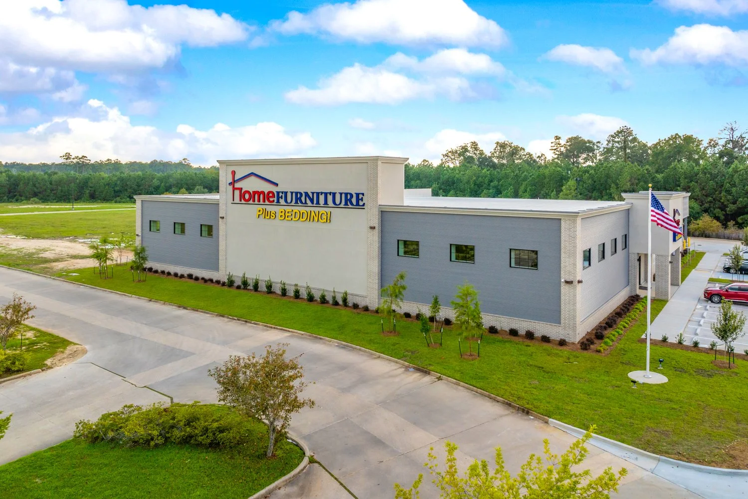 This is a 32,000 SF pre-engineered building by Butler Manufacturing which included a 25,000 SF sales floor, 1,500 SF warehouse, and 1,500 SF office buildout area. The building foundation consists of a post tensioned concrete slab supported by over 400 timber piles. The exterior façade finishes consist of Butler horizontal and vertical paneling, stucco, and masonry. Inside the building, finishes include drywall, paint, LVT flooring, and ACT ceilings. HVAC units were able to be installed, out of sight on a hidden mezzanine framed out above the bathrooms. A distinctive feature of this project was the extensive number of floor boxes embedded in the slab, complemented by an abundance of wall outlets, all carefully coordinated with the owner to ensure sufficient power for all the sales floor displays. Additionally, pegboard was installed throughout the entire sales area to facilitate wall-mounted displays.