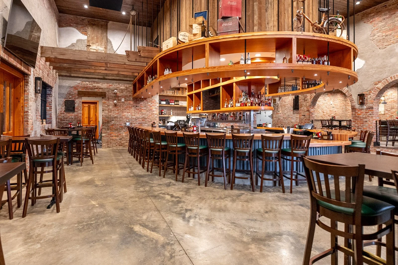 The two live oaks are surrounded by a 4,075 SF deck, a 16-foot-tall fireplace, a sunken sitting area under a pergola, three cabanas, and outdoor dining area that opens to the deck with four large hydraulic doors. The deck itself is constructed with all low-maintenance materials, like composite decking, light-gauge/structural steel framing, and helical deep foundations (to reduce impact to tree root systems), so there is no rotting deck for owners to deal with in just a few years. The building is beautiful with Chime’s signature finishes of antique brick, old-world plaster, antique wood, etc.