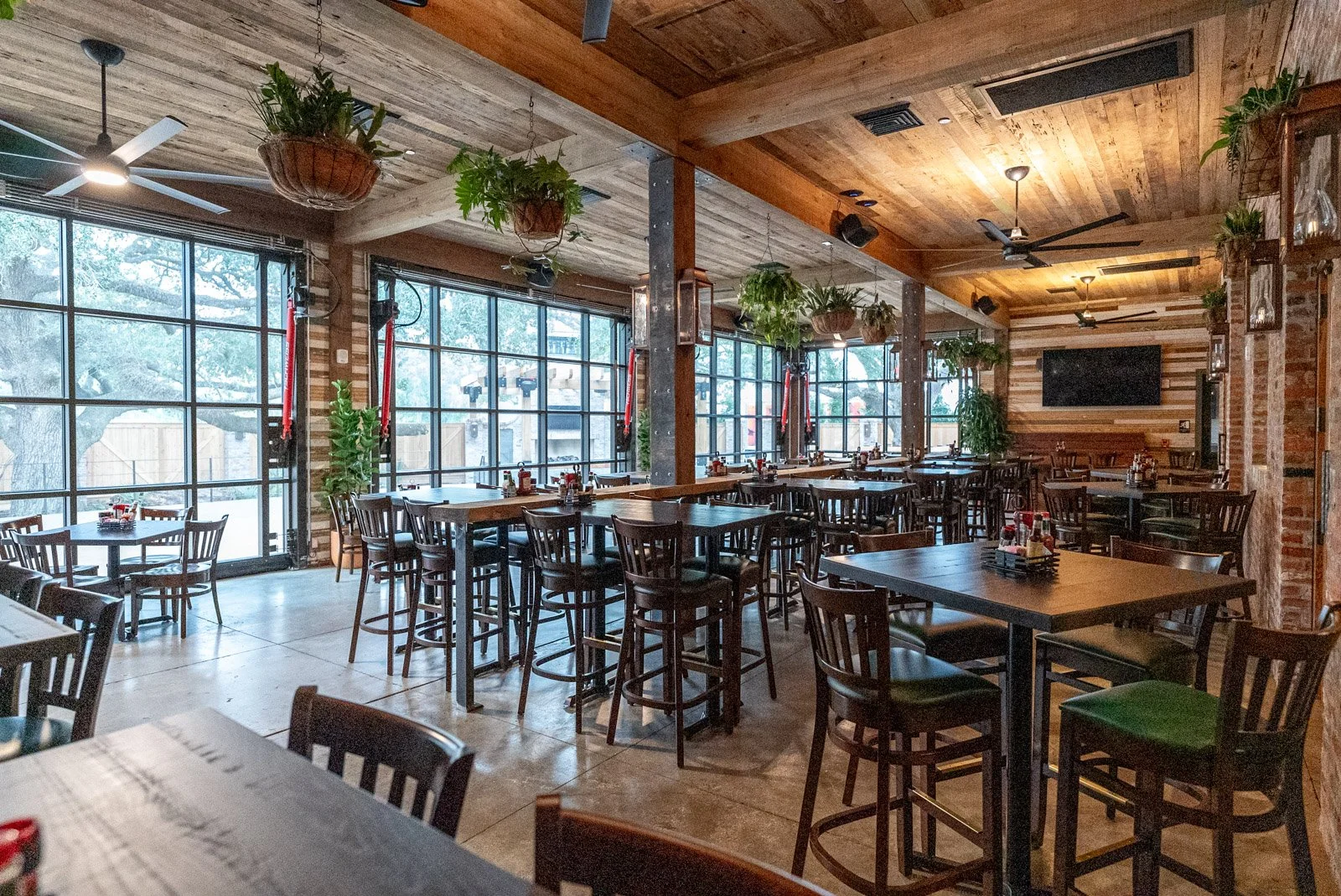 The restaurant is elevated about 3 feet above existing grade to comply with flood elevation requirements, but in return, it provided an opportunity for a grand front entrance. It also has an awesome patio and deck featuring two live oak trees.