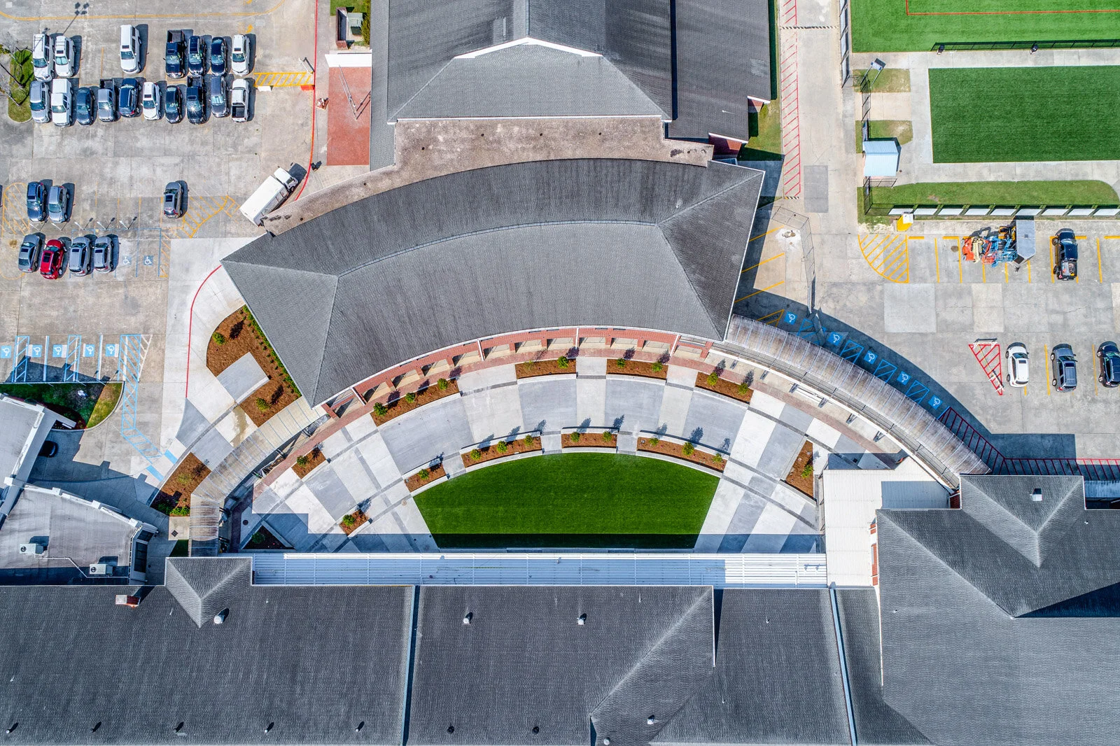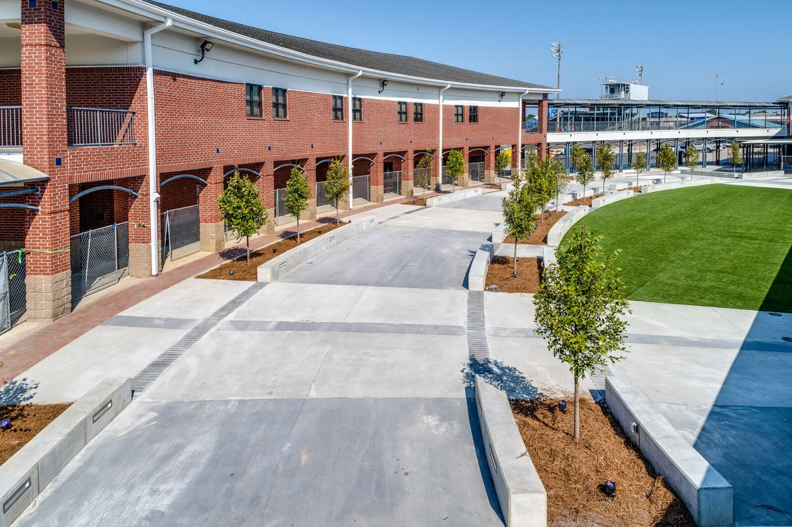 We demolished the existing courtyard in its entirety, then installed new sub-surface drainage and lighting, foundations for the concrete radius seat walls, and new concrete paving with paver ribbons throughout to create the architecturally designed borders. The deliberately thought out landscaping and landscape lighting includes a LED lighting system integrated into the seat walls and athletic turf in place of additional paving. The athletic turf allows for a functional permeable surface and provides the appearance of grass without adding maintenance for the school. Where the courtyard meets the cafeteria building, guests will find a new aluminum walkway canopy complete with lighting and outdoor ceiling fans.