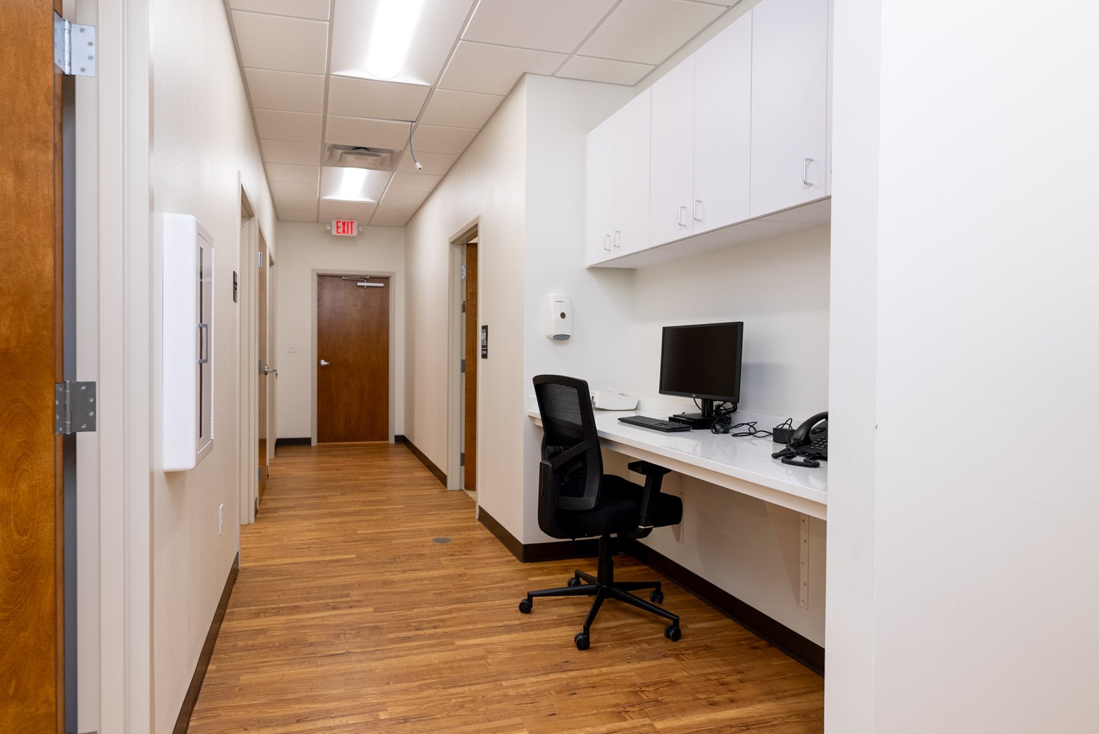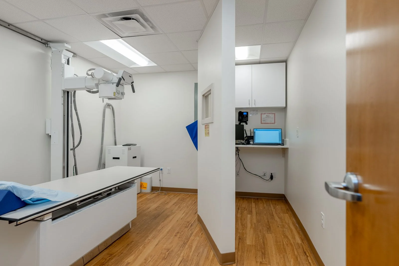 This is the third project with this client. The project involved the renovation of an existing 4,300-square-foot building, which included a complete gut of the interiors, cutting back and demolishing the front-view facade wall in its entirety, as well as a portion of the back wall. We integrated both a new metal stud-framed wall with storefront windows and a new CMU wall into the existing structural steel frame, structural CMU walls, and the remaining roof. Exterior finishes consist of new paint applied over existing areas, a storefront, stucco, a sheet metal roof cap, and an eyebrow-framed canopy with a sheet metal wrap. Additionally, we poured concrete over sections of the demolished parking lot, added striping, incorporated an entrance walkway ramp, and installed a handrail system. The building's interiors feature metal stud-framed interior walls with gypsum board, acoustical ceiling tiles, new millwork with solid surface tops, and laminated vinyl tile flooring. The clinic layout includes reception areas, lobbies, exam rooms, break rooms, and an X-ray lab.