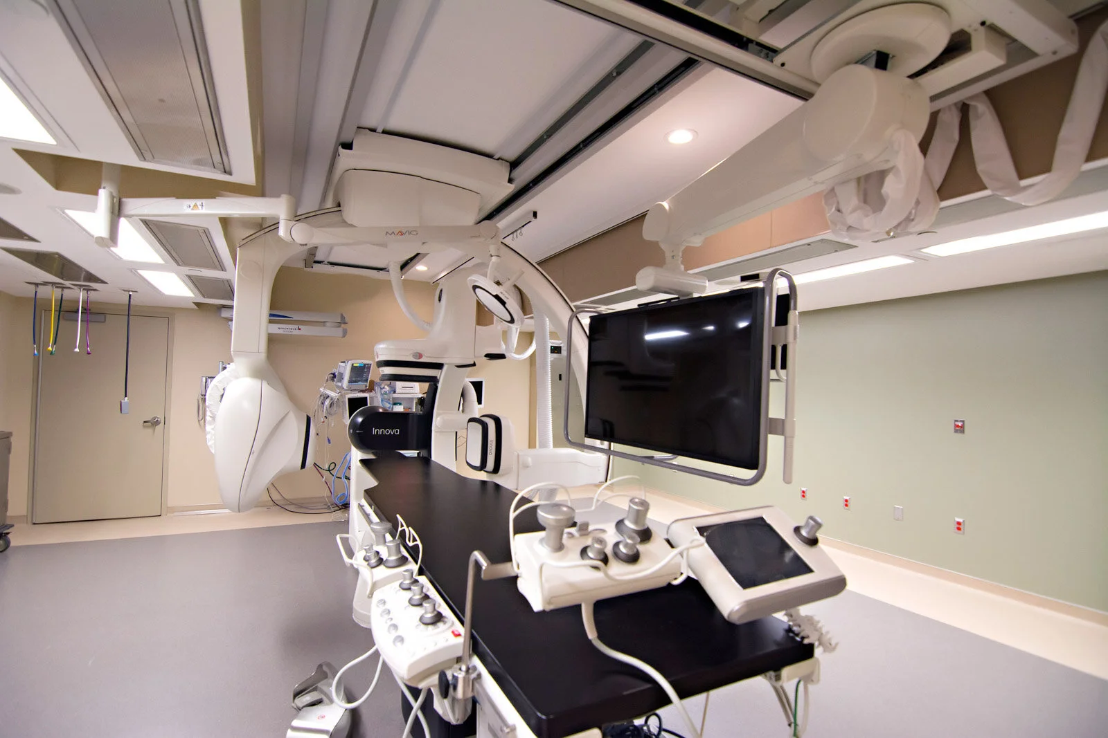 This design build project converted an existing special procedure room storage area into a new electrophysiology suite. New MEP infrastructure was required including electrical upgrades, medical gas, and HVAC systems. One of the biggest challenges was working in an existing operational lab on the floor below to install new conduit for power and cabling. Interstitial space was limited and required extensive coordination to accommodate new HVAC equipment, medical gases, and structural steel.