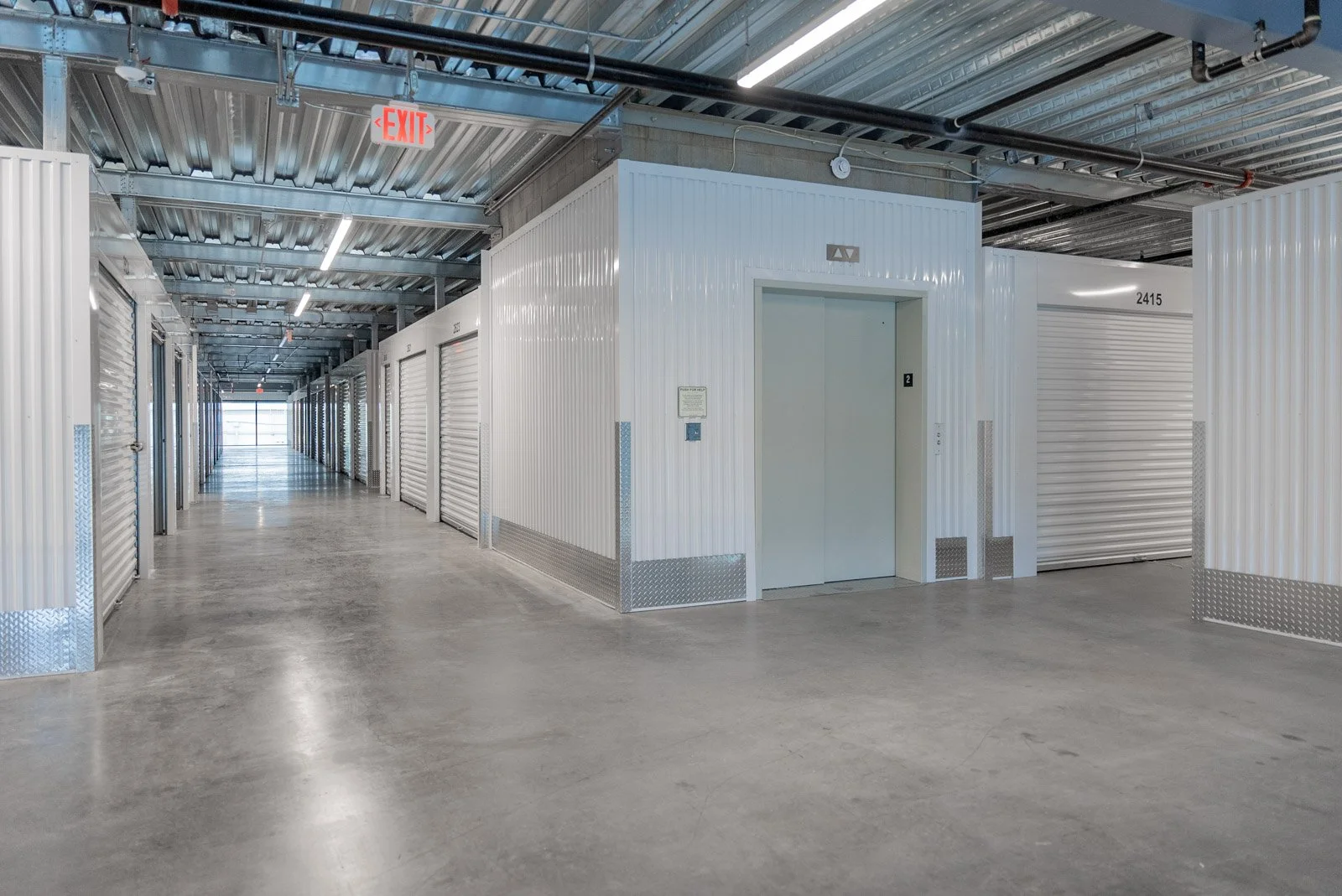 The building provides a secure and safe storage experience, featuring an 8’ tall perimeter fence and an integrated access control and security system. Units range from 5x5 to 10x25 and include roll-up doors and security mesh. The hallway system is a corrugated metal panel equipped with corner guards and kick plates throughout. Two elevators and covered offloading areas allow tenants to easily offload and store their belongings throughout the three-story buildings.