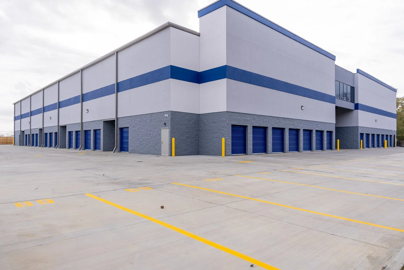 This is a ground-up 132,000 SF, three-story storage facility with over 800 climate-controlled units and 80 RV and boat parking spots. The facade features a stucco finish with a split-face CMU accent band. The storefront windows are a curtain wall application, totaling over 5,000 SF of impact-rated glass. The HVAC system was designed with an economical and efficient approach, employing minimal ductwork and utilizing vertical supply and return runs to acclimate the entire space.