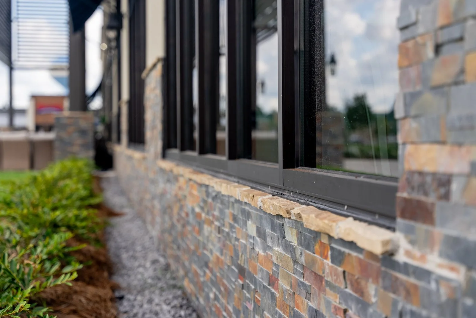 Of course, no build is completely without challenge, and with the Gonzales location, there were quite a few. Most surprising was the discontinuation of certain stone materials used previously to line the facade of past American Factory Direct showrooms, threatening the continuity of the branding. However, thanks to the ingenuity of our team, this problem was solved quickly. A replacement material that closely resembled the past stone was sourced, and large slabs of the previous material was cut into smaller pieces and repurposed as stone caps, maintaining the integrity of American Factory Direct’s vision.