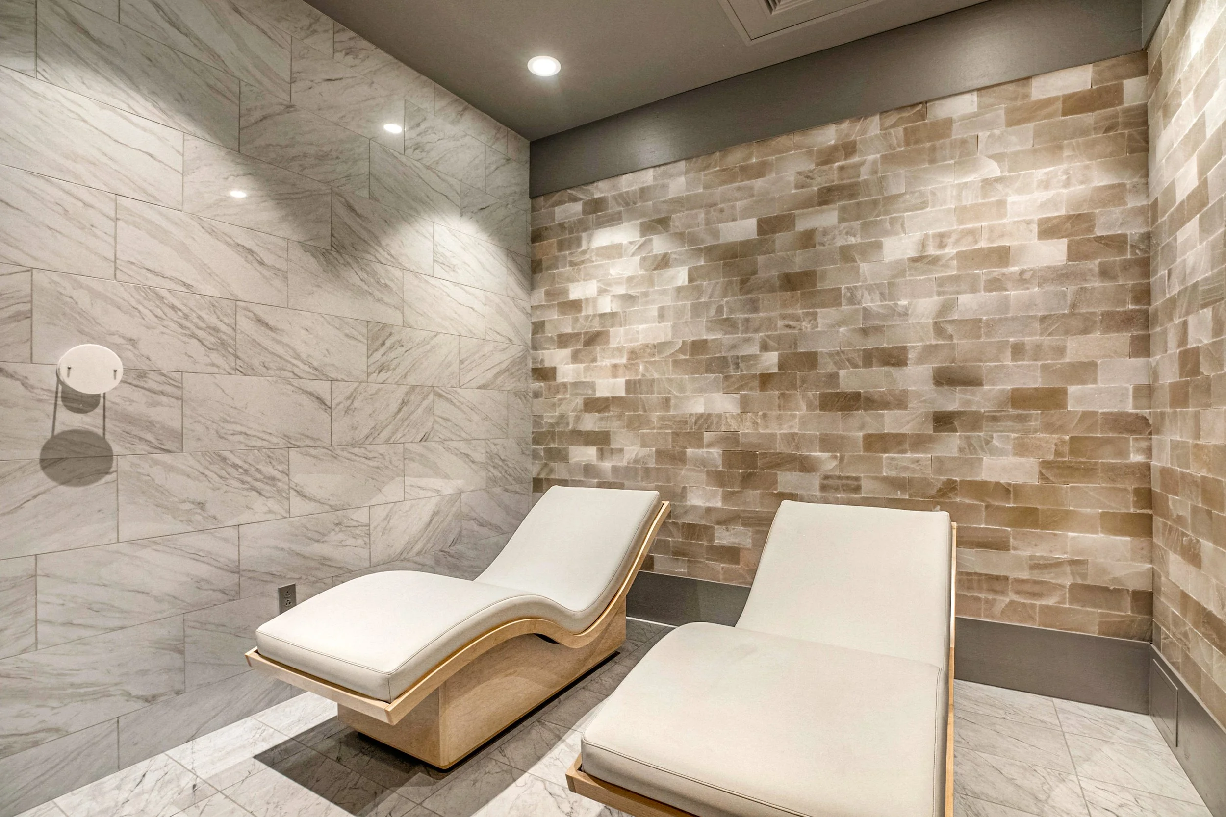 The addition of a salt room to this spa is a unique feature. Our team installed two anti-gravity chairs and a salt generator on the opposite side of the wall to disperse salt into the room. In addition, we added LED rope lights behind the salt bricks to enhance the soothing ambiance.