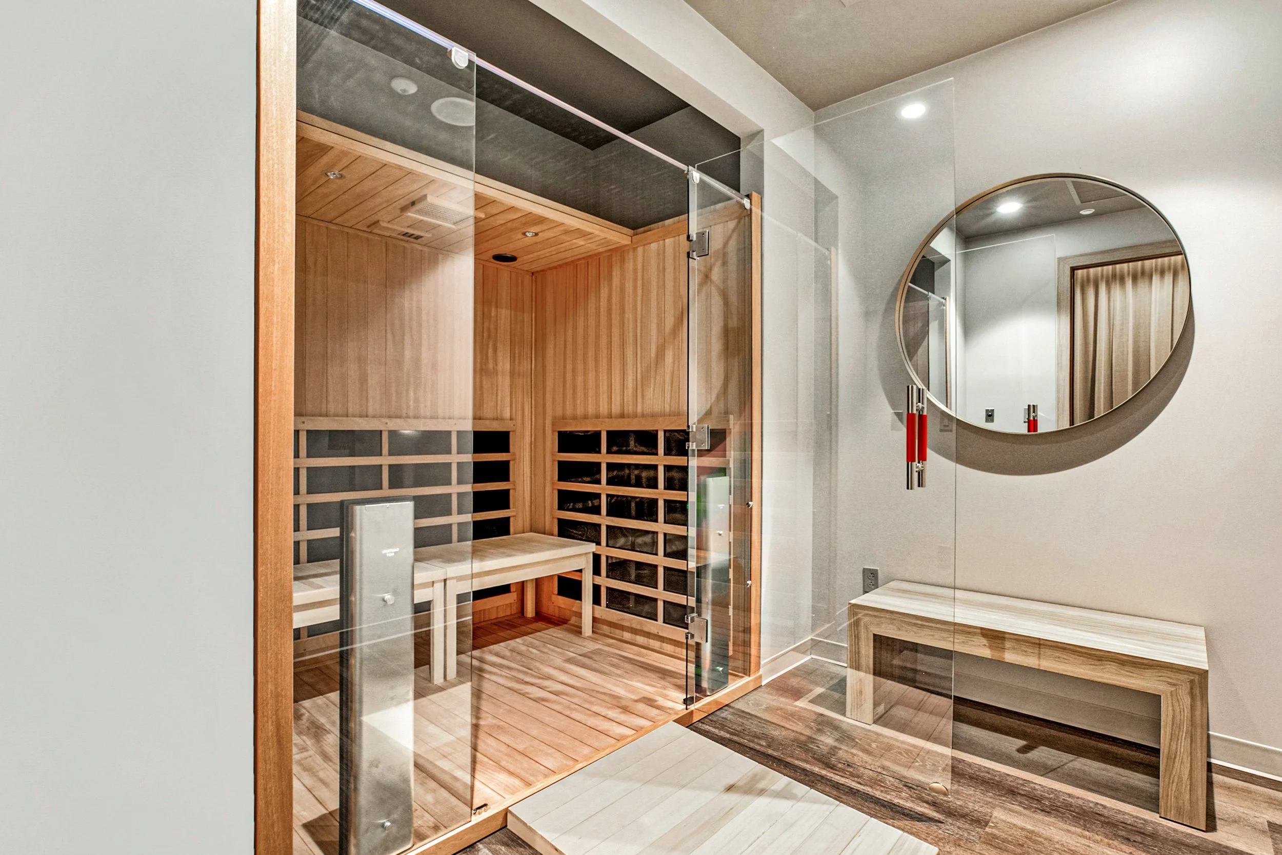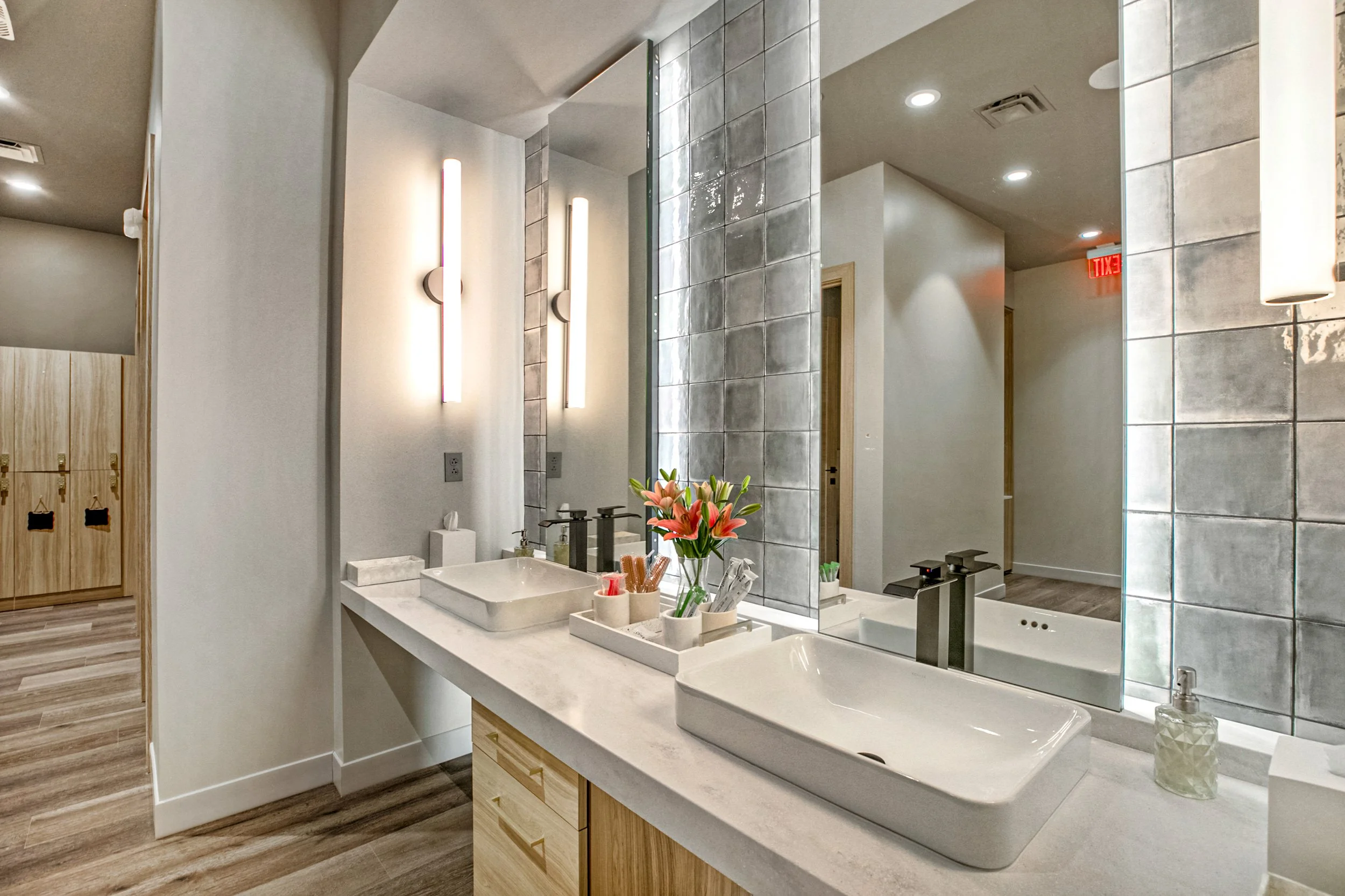 The locker rooms and showers are unique, with dual vanities and backlit mirrors, as well as mirrored floor, wall, and ceiling tiles. Near the locker rooms is a quiet waiting area where clients will relax before their service. This area comes equipped with white noise, speakers for the spa music, and an acoustic wall panel to maintain the relaxing ambiance of the room.
