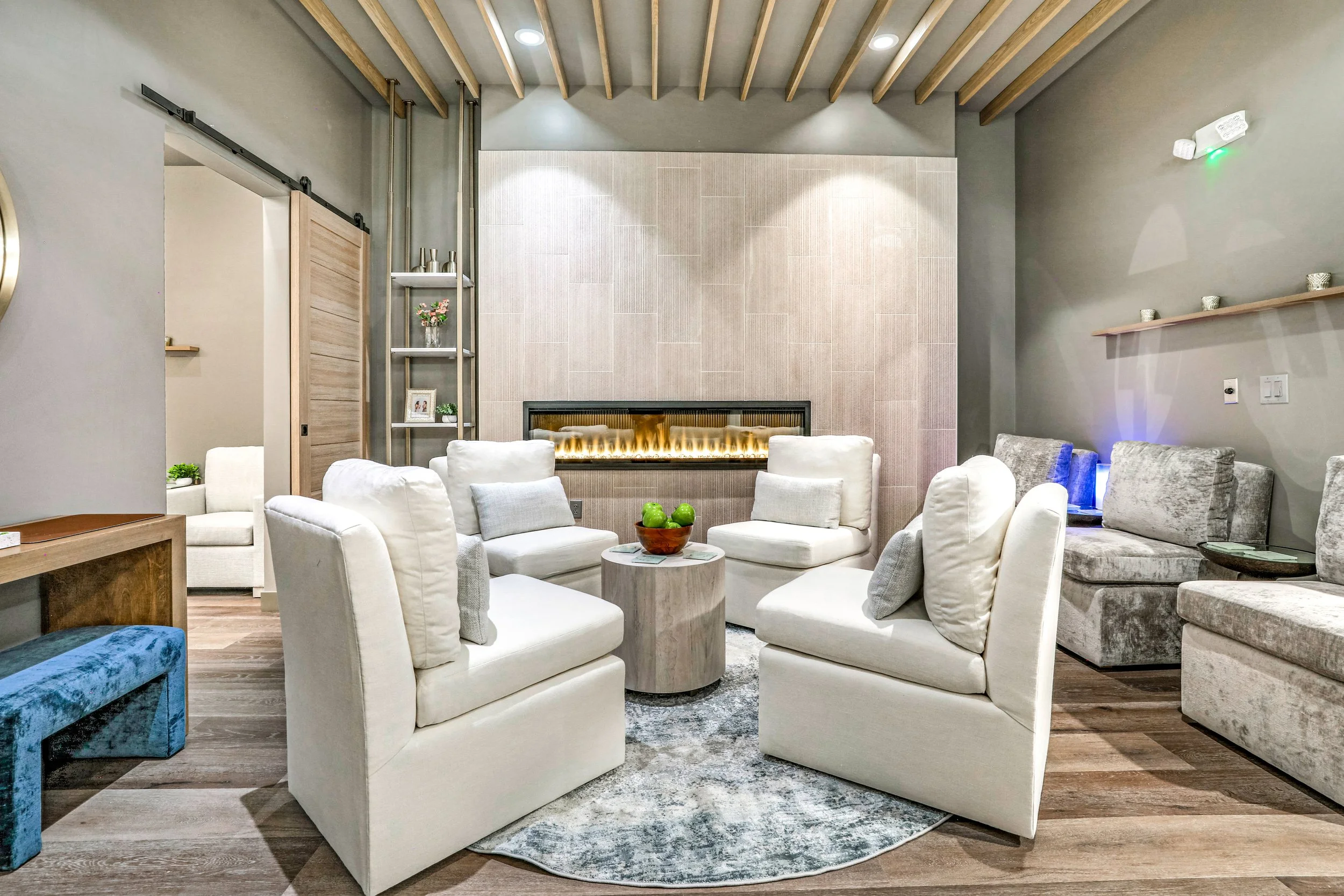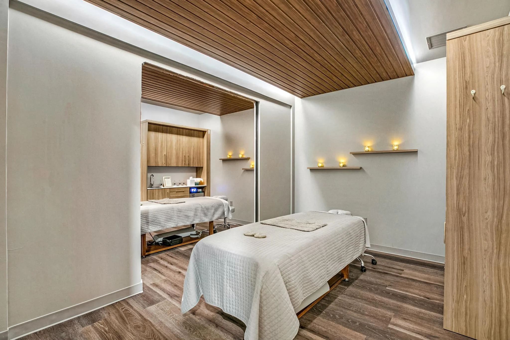 The sauna room is an outstanding feature of the facility. It is a spacious, four-person ADA-compliant sauna that boasts beautiful wood ceilings that span throughout the entire space. The treatment rooms are equally impressive, with wood ceilings that maintain a consistent theme of natural materials throughout the facility. The construction team ensured that the installation of the wood ceilings was carefully executed to create a visually stunning result that meets the highest standards of quality and craftsmanship.