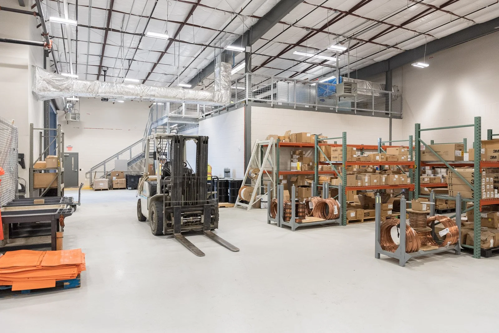 During the demolition phase, we reimagined the layout of the building center, making significant changes to optimize functionality. By removing several walls, we created a spacious material store room and an equipment mezzanine atop the storm room. During times of unforeseen events or crises, this storm room acts as the campus’s safe room. This whole facility is essentially meant to operate during emergency situations, such as hurricanes. To ensure the safety of the entire facility, we installed a new sprinkler system. This system seamlessly transitions from an interior wet system to a dry system as it extends to the loading bays, safeguarding against freezing temperatures.
