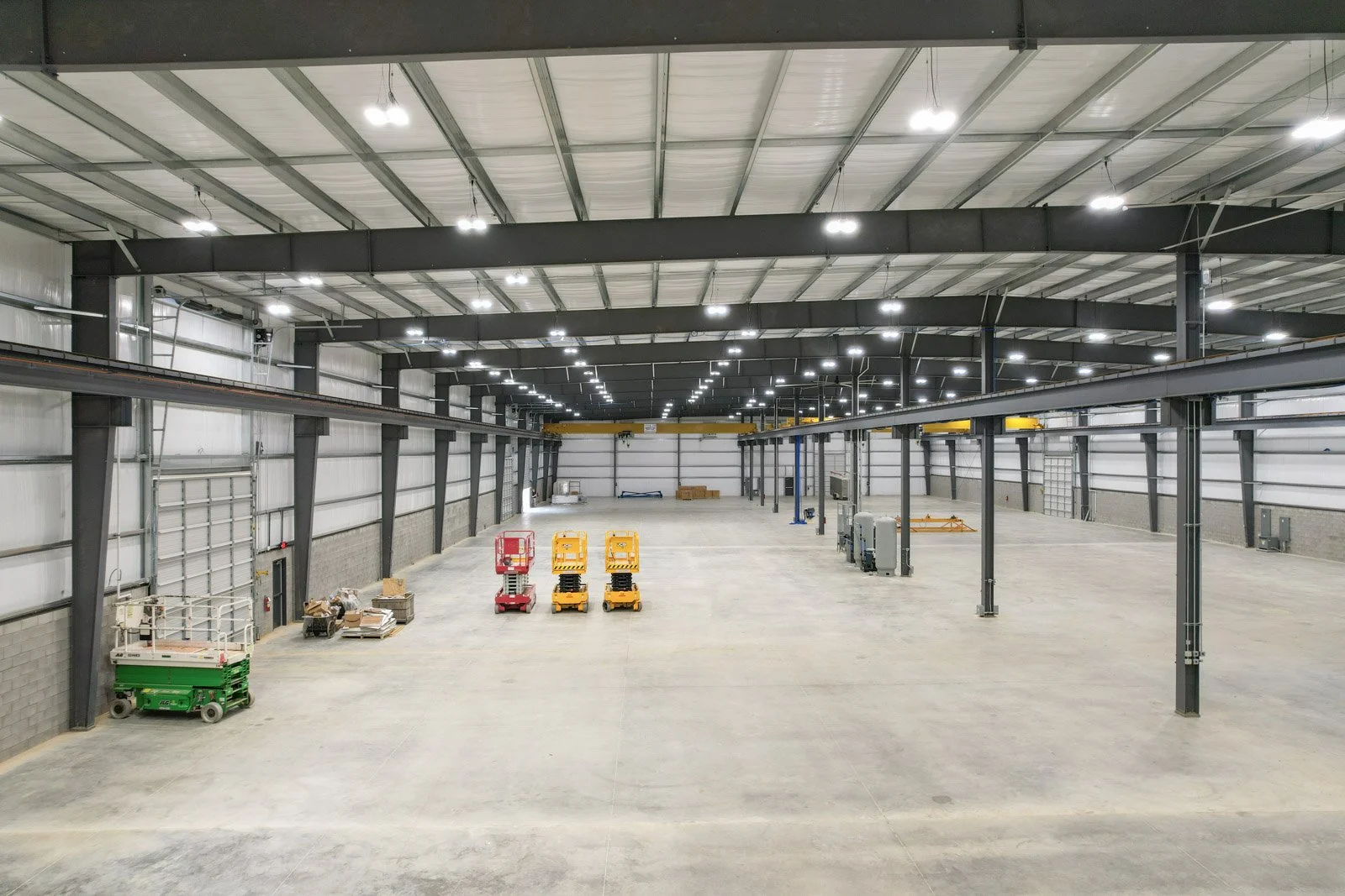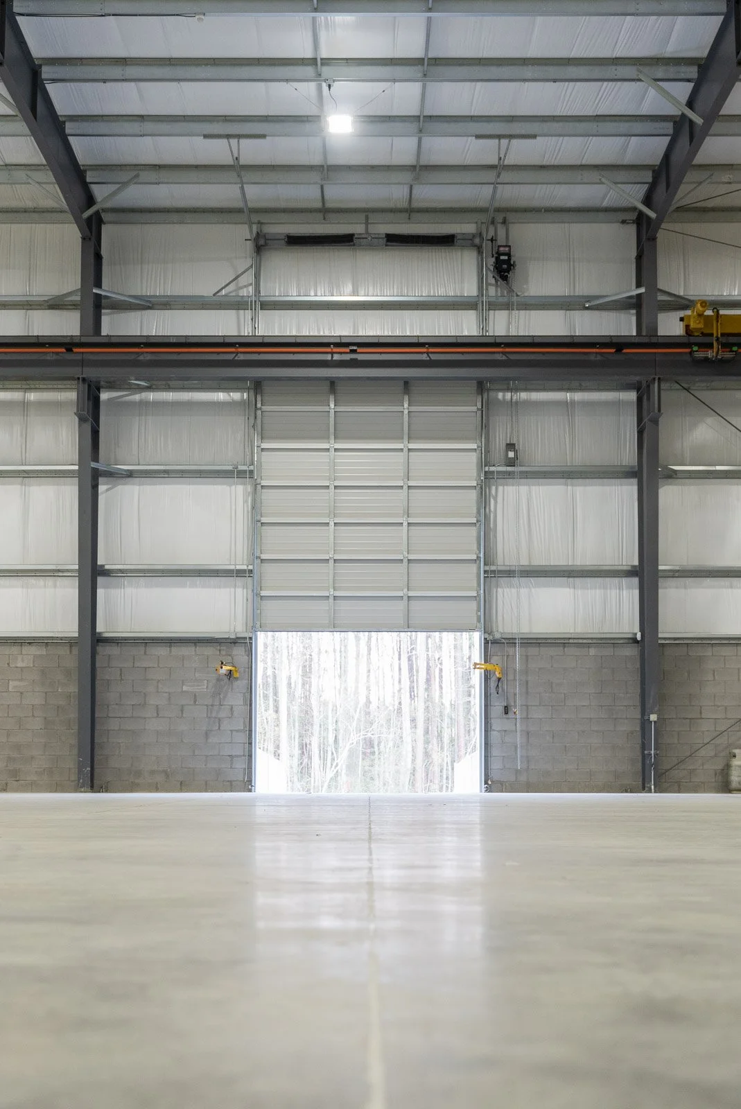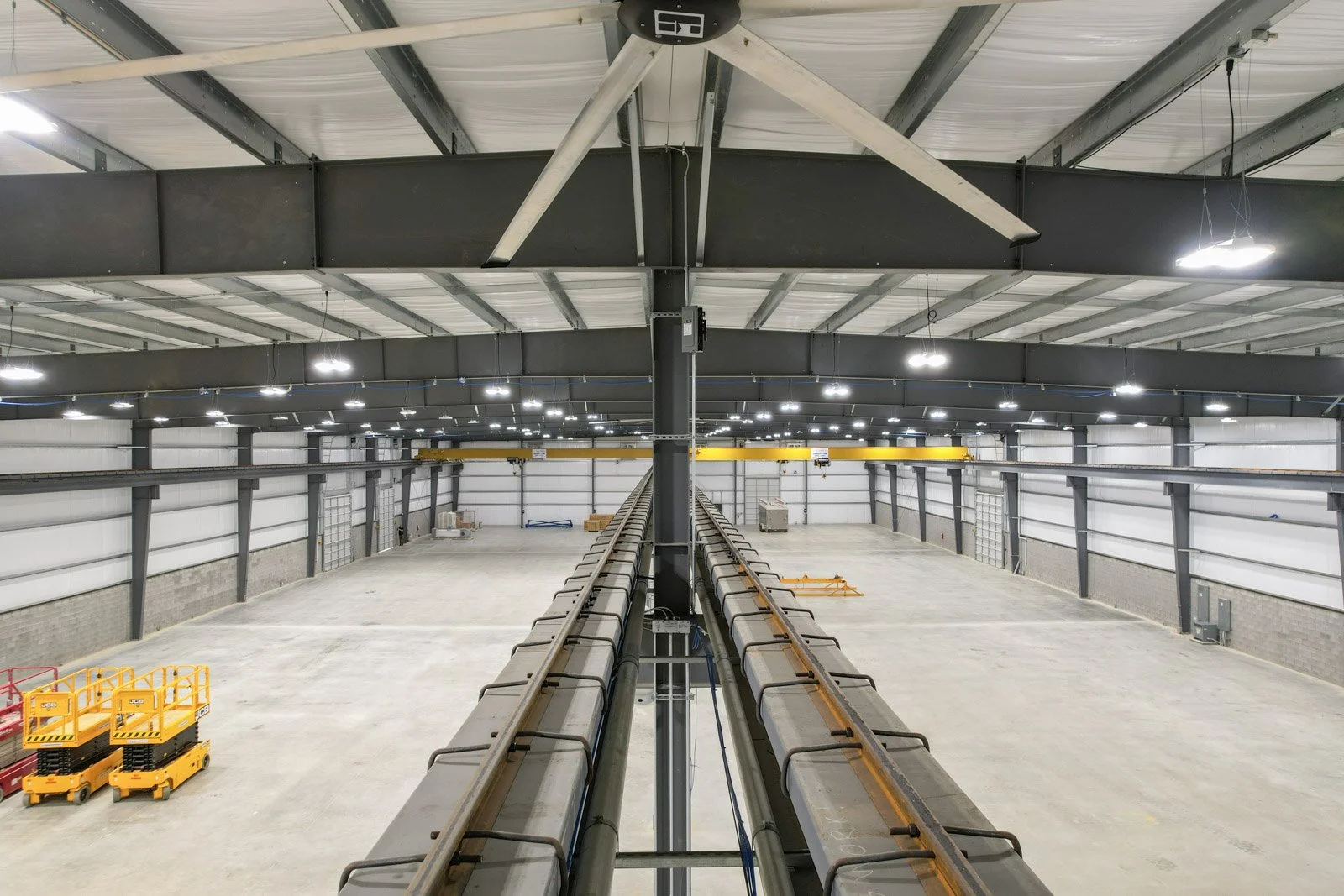 To support the drive-through lanes, the flooring has been reinforced to accommodate the weight of an 18-wheeler truck. Additionally, the central area of the warehouse has been further strengthened to serve as a staging area for equipment. Thanks to the utilization of a Butler building, a remarkable 150 feet wide and 400 feet long space has been created, allowing for the installation of the cranes and their accompanying beams throughout the structure.