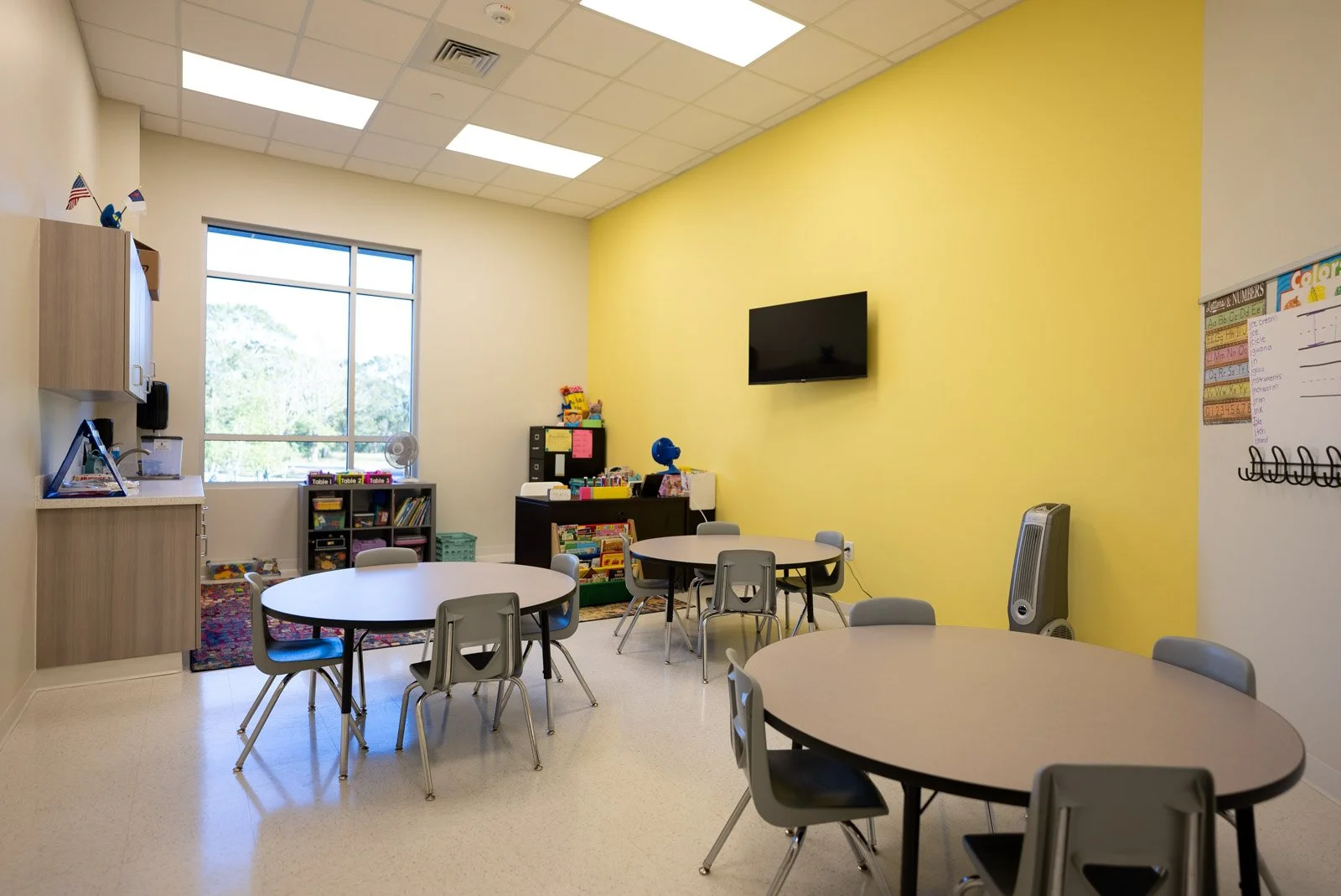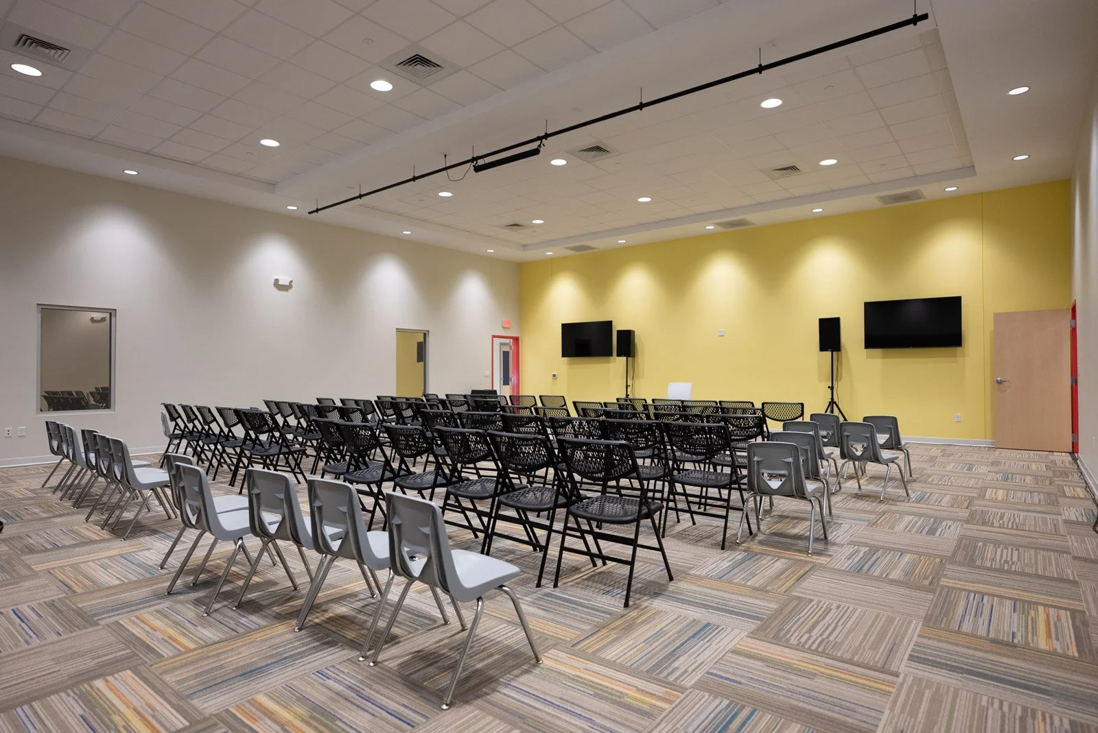 There are two large group worship venues for children, one is for preschoolers and the other is for elementary children. Each worship venue is designed for children’s ministries. The venues are equipped with large TVs and sound equipment for worship services.