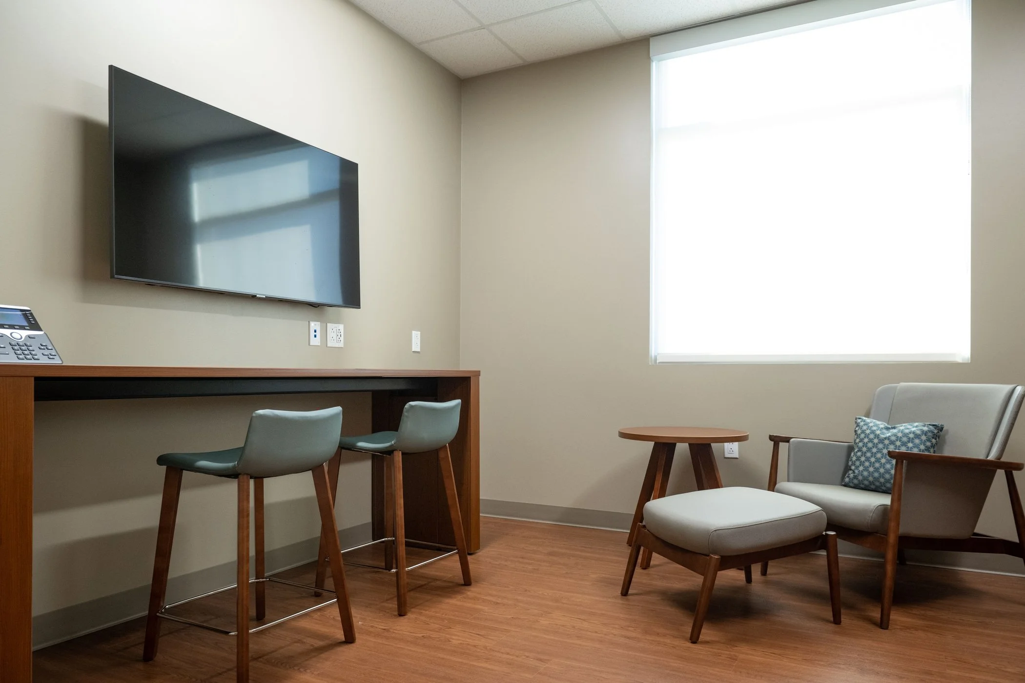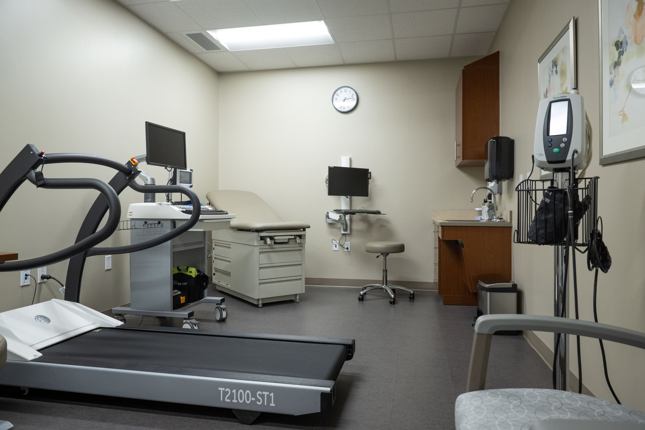 The 2,000 sq ft wellness suite includes a stress test room, exam rooms, doctors’ offices, and a business center. The wellness suite is optimally laid out for efficient workflow and patient care. Artwork lines the walls of each room to make the space more aesthetically pleasing. The furniture is functional and provides warmth to the space to make patients feel more comfortable.