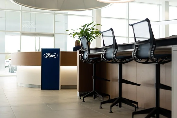 The showroom was built to optimize the customer experience. The open-concept space with glass offices allows customers to be greeted by employees immediately. The gloss tiled floor is easy to maintain and provides an opportunity for customers to easily see underneath displayed vehicles. Pops of ‘Ford Blue’ increase brand recognition and add color to brighten the space. The lighting system is modern in appearance and function. The lights change color to create an optimal ambiance. As customers wait for service or information on vehicles, they can enjoy an upscale seating area complete with a coffee bar. There is a designated children's seating area with entertainment features.
