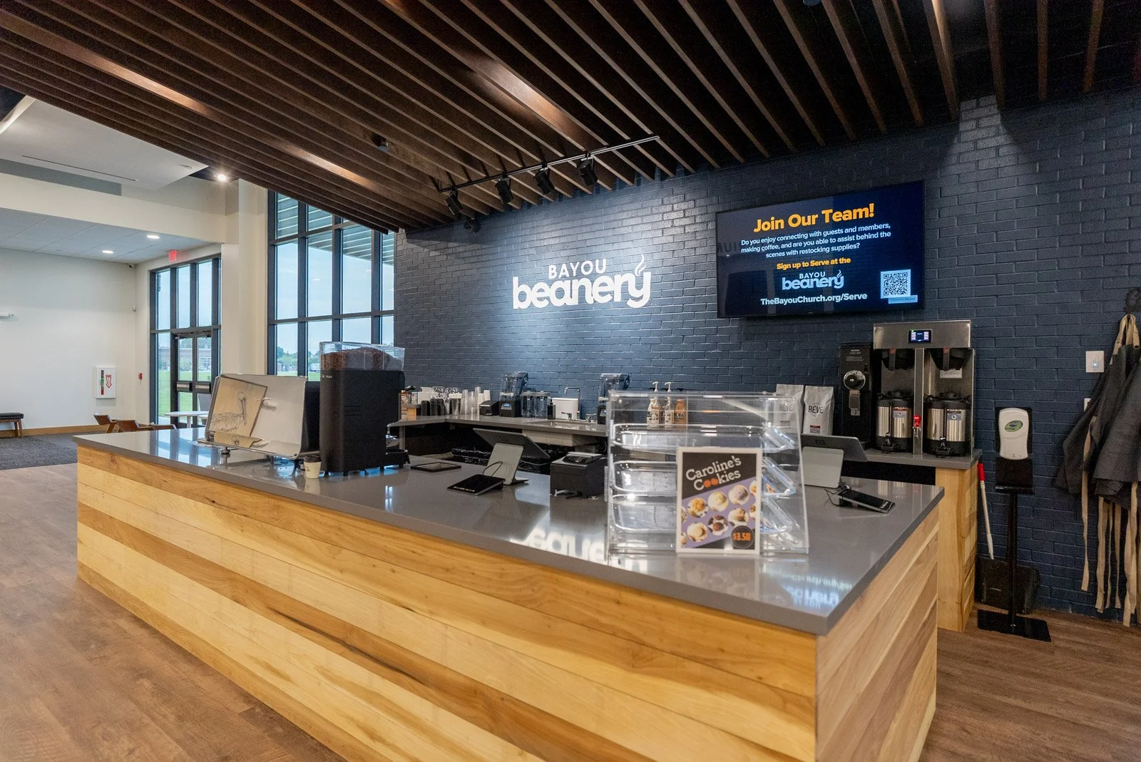 The “Bayou Beanery", a spacious and accessible coffee shop, offers a new and welcoming space for fellowship. Adjacent is a new patio, extending the gathering space for continued community connections.