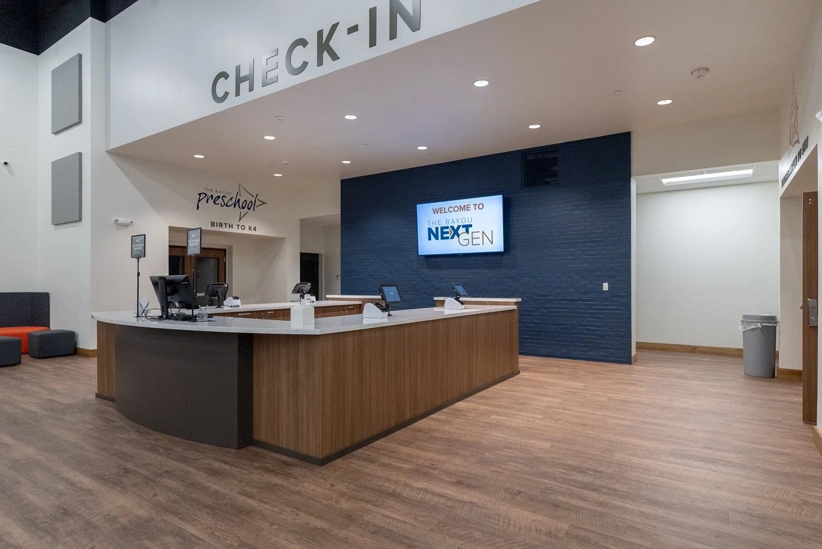 We collaborated with Pastor Sean Walker and The Bayou Church from the beginning, allowing us to envision a future that met their ministry needs. Conversations about the church's vision led to our first action item: creating a new, prominent main entrance. Upon entering the church, you’re greeted by a redesigned lobby with a 360-degree view, providing transparency and openness. The First Steps classroom, once tucked away, is now visible, fostering a more connected community feel.